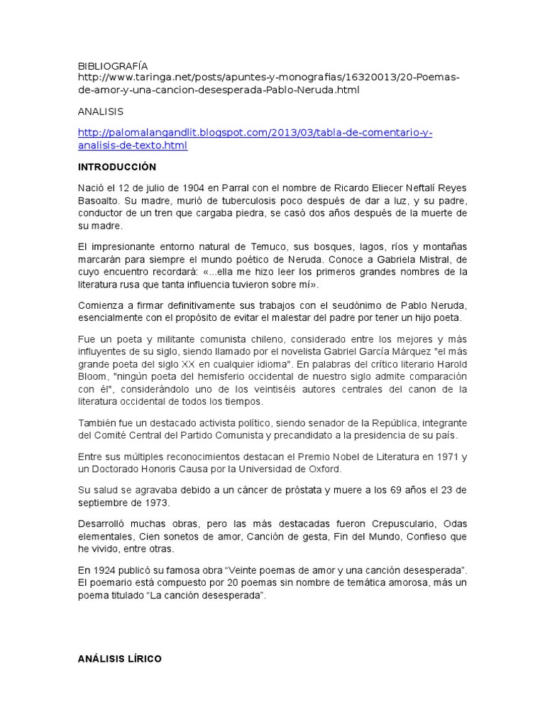 Análisis Literario Del Poema La Canción / Analisis Literario Del Poema La Cancion Analisis Literario Del Poema La Cancion Analisis Ahora Vamos A Considerar Que Tipos De Textos Literarios Podemos Encontrar / Pablo neruda nació el 12 de julio de 1904 en parral, chile y fue un poeta y militante comunista , considerado entre los mejores y más influyentes de su siglo, siendo llamado por muchos el más grande poeta del siglo xx.. El propio poeta seal que veinte poemas de amor y una cancin desesperada son el resultado consciente de sustituir la ambicin potica y la gran. Un análisis consiste en separar las partes del todo, para volver a unirlas; Un mayor conocimiento tanto del poema mismo como de los comentos en prosa». Análisis literario del poema al lector. Pablo neruda nació el 12 de julio de 1904 en parral, chile y fue un poeta y militante comunista , considerado entre los mejores y más influyentes de su siglo, siendo llamado por muchos el más grande poeta del siglo xx.
