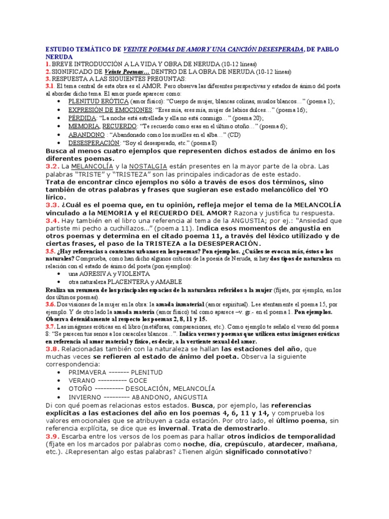 Trabajo de lengua y literatura 20 poemas de amor y una canción desesperada. Analisis de figuras literarias en el poema xx de pablo neruda. Estructuralista, impresionista, marxista, desconstruccionista, psicoanalítica, lingüística, sociológica, historicista, filosófica, etc. Estructura literaria de las «canciones entre el alma y el esposo». → subgénero (himno, canción, égloga, elegía, oda, romance, letrilla.