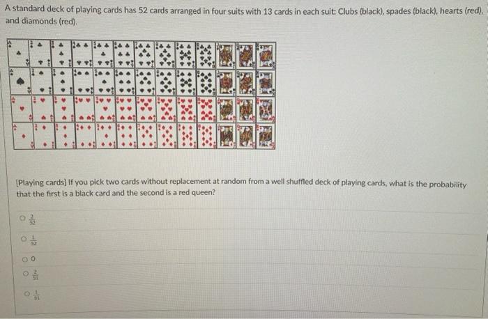 How many clubs are in a deck of 52 cards? Number of queens in a deck of cards. So, we have (52/4)=13 cards of each suit and each suit has one king card. There are 26 red cards and 26 black cards in the standard deck of 52 playing cards. How many spades are in a deck of cards? 26 cards are red and an equal number of cards are black. This is because there are two red suits, which are hearts and diamonds. There are 13 cards in each suit, of which 1 is king. These values are ace through king. Hence, the probability of event e 1 occuring is. Assuming that you mean a standard deck of playing cards (if you don't, the question is unanswerable). Drawing a king of spades. How many red cards are in a deck?